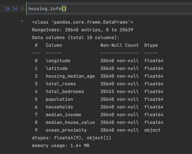 数据基本情况见上图,总共有10列数据,一共有20640个数据,其中total_bedrooms有20433个非空值,意味着有207个空值。
