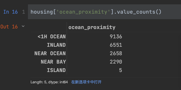 观察ocean_proximity中有多少种情况,使用value_counts()